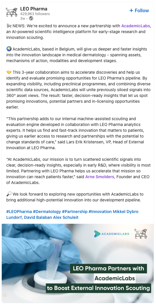 While most tools track clinical trials, we’re collaborating with LEO Pharma to bring earlier visibility into emerging assets - uniting signals scattered accross sources, from very early preclinical stages onwards, and for all therapeutic areas, so promising science reaches patients faster.